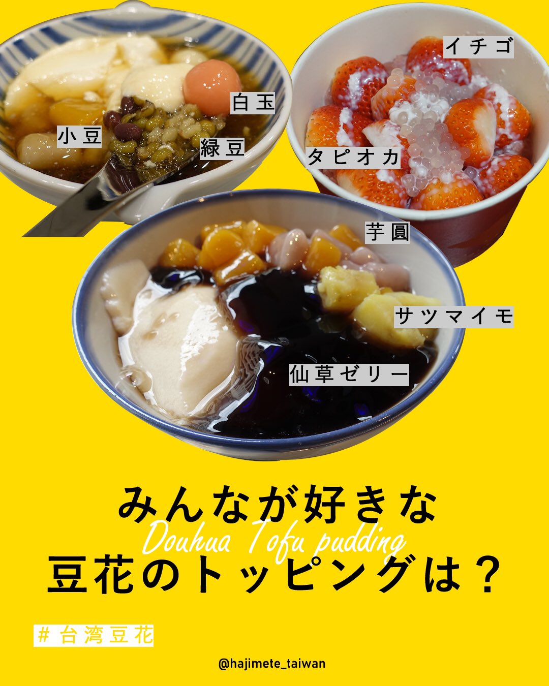 おっくん 台湾グルメと中国語 インスタグラムのストーリーで 好きな豆花のトッピングは と質問したら 1位は 芋圓 ピーナッツ 2位は 小豆 紅豆 3位は ハトムギ 薏仁 でした 芋圓のモチモチした食感が好き 最近のお気に入りは南所